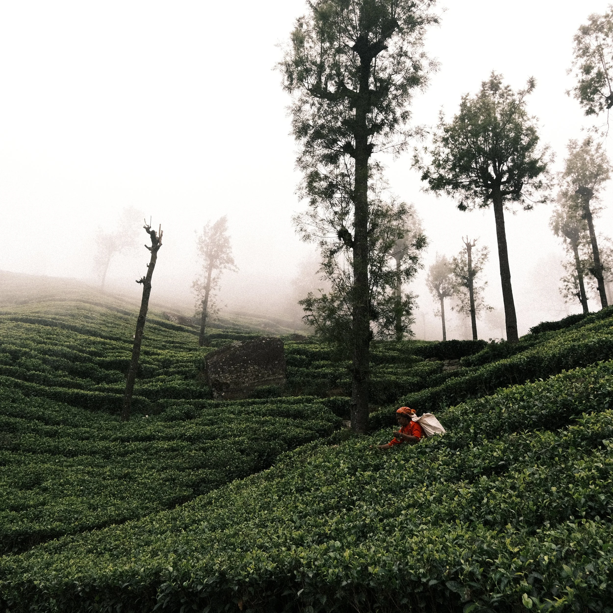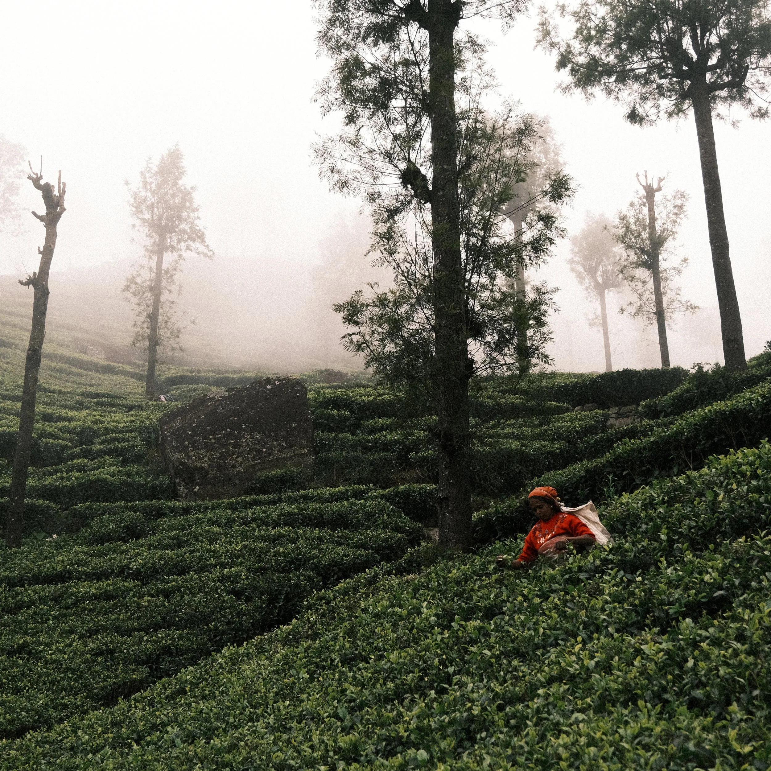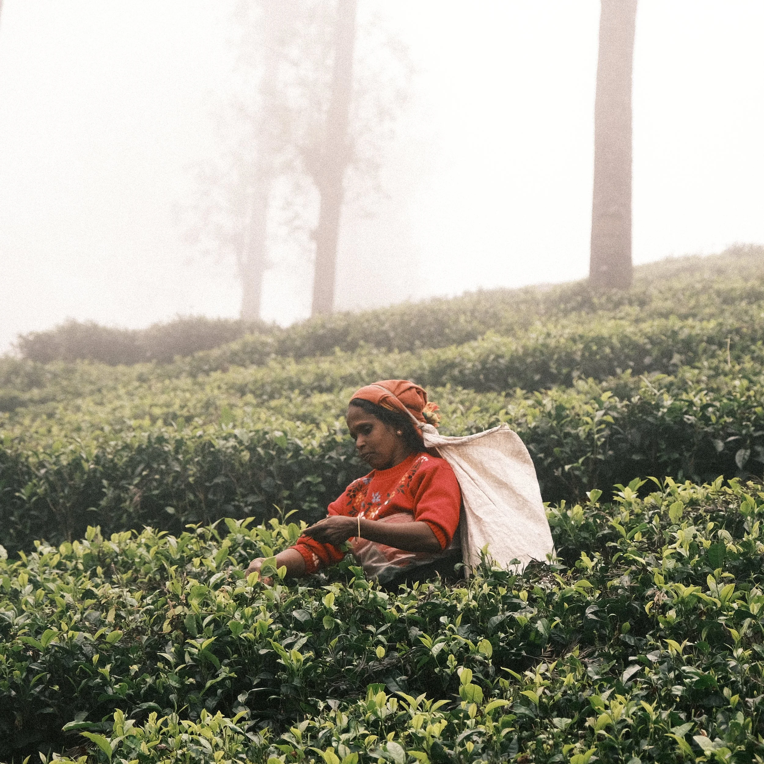 Antes de que el sol disipe la niebla, las recolectoras ya están en los campos. Sus vestidos de colores intensos irrumpen entre las hileras verdes mientras avanzan con movimientos precisos, recogiendo hoja por hoja. El gesto se repite miles de veces al día. Es un trabajo físico, heredado de la estructura de las plantaciones coloniales, donde la belleza del paisaje contrasta con la dureza de la labor. Con la primera luz, los canastos comienzan a llenarse.