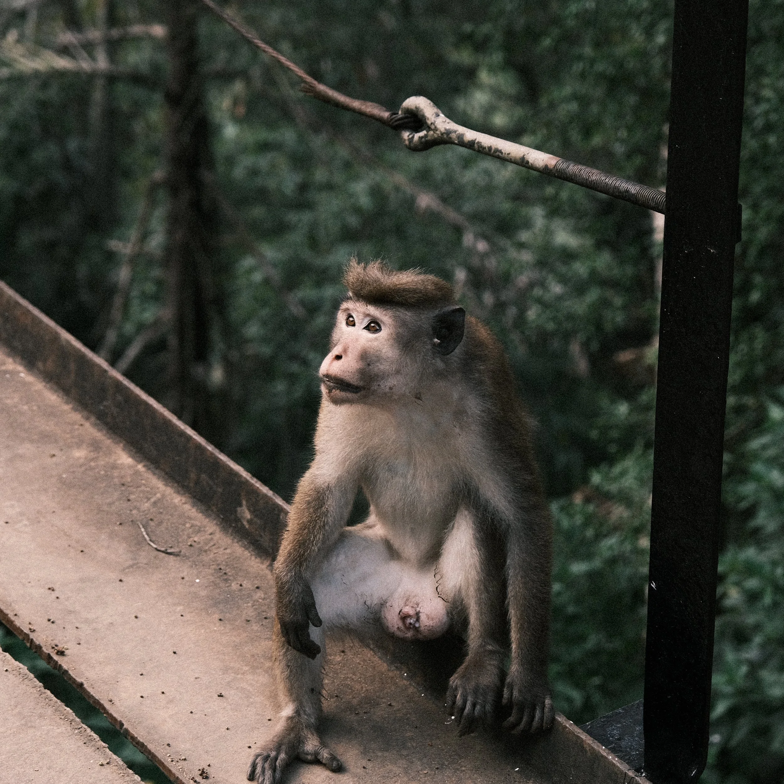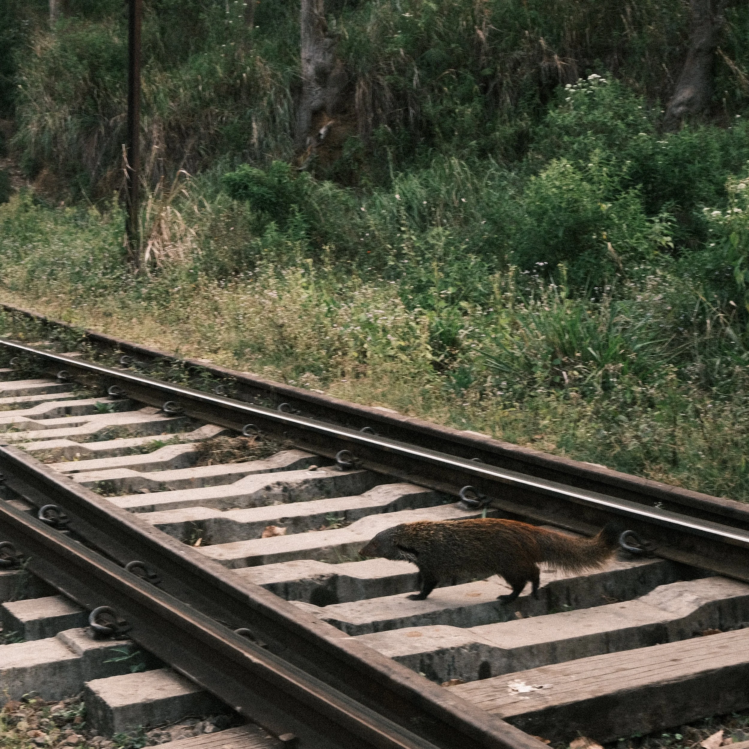 Las plantaciones no están vacías. Entre los senderos y las vías aparecen monos, mangostas, aves y reptiles que habitan este mismo territorio moldeado por el ser humano. Los encuentros son breves: miradas que se cruzan y desaparecen entre los arbustos. La frontera entre cultivo y selva es difusa, y la vida salvaje se mueve libremente entre ambos mundos.
